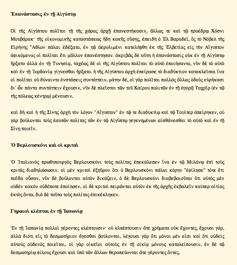 Ισπανός στην καταγωγή και εδώ και πολλά χρόνια κάτοικος Αγγλίας, ο Joan Coderch-i-Sancho, έχει φτιάξει ένα απίθανο site όπου γράφει τα τελευταία νέα σε αρχαία Ελληνικά.